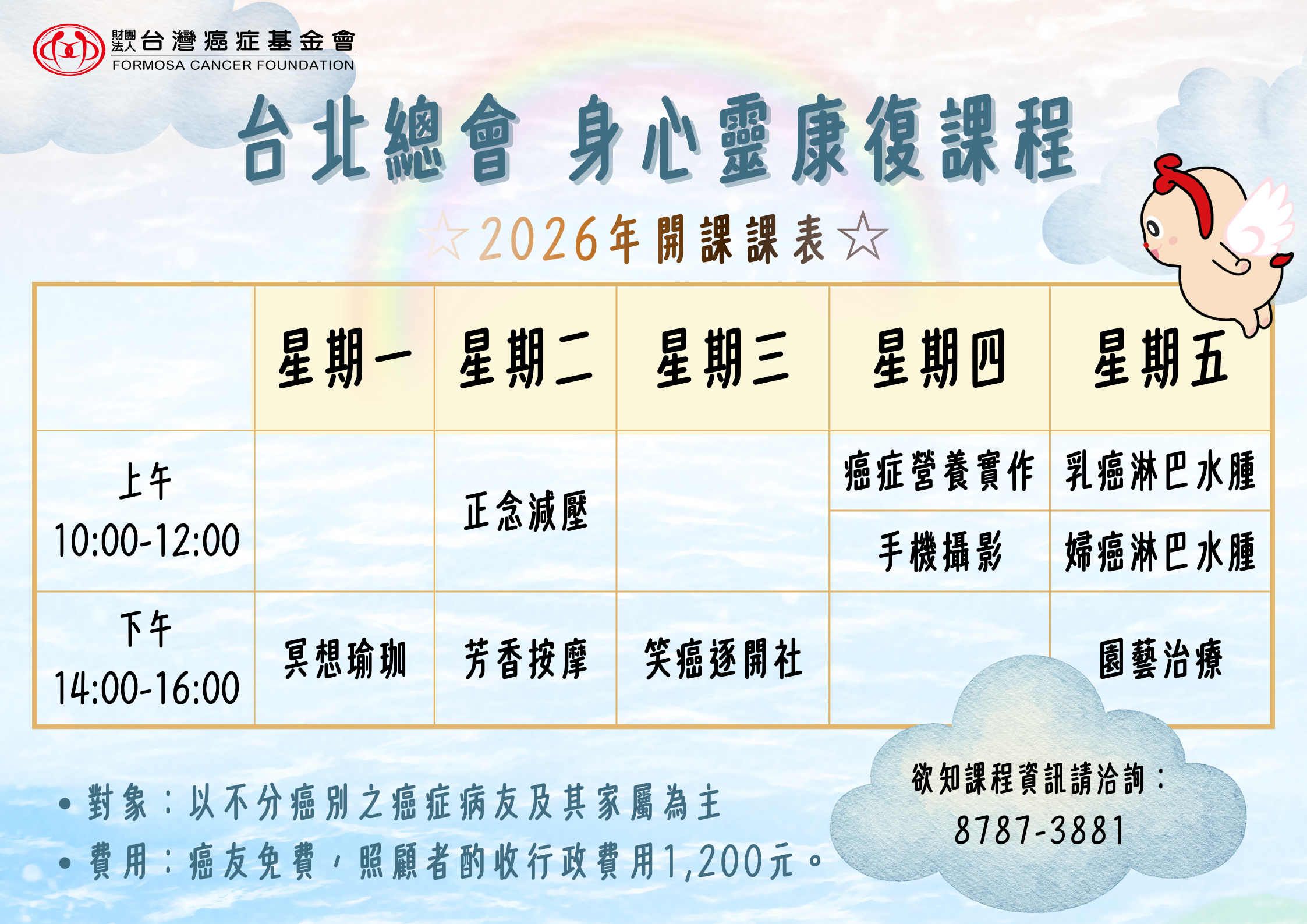 2. 招生以未上過課程之新生為首要,舊生癌友若有興趣再上同一門課(限一次),將列為候補名額,並酌收行政費用1,200元。