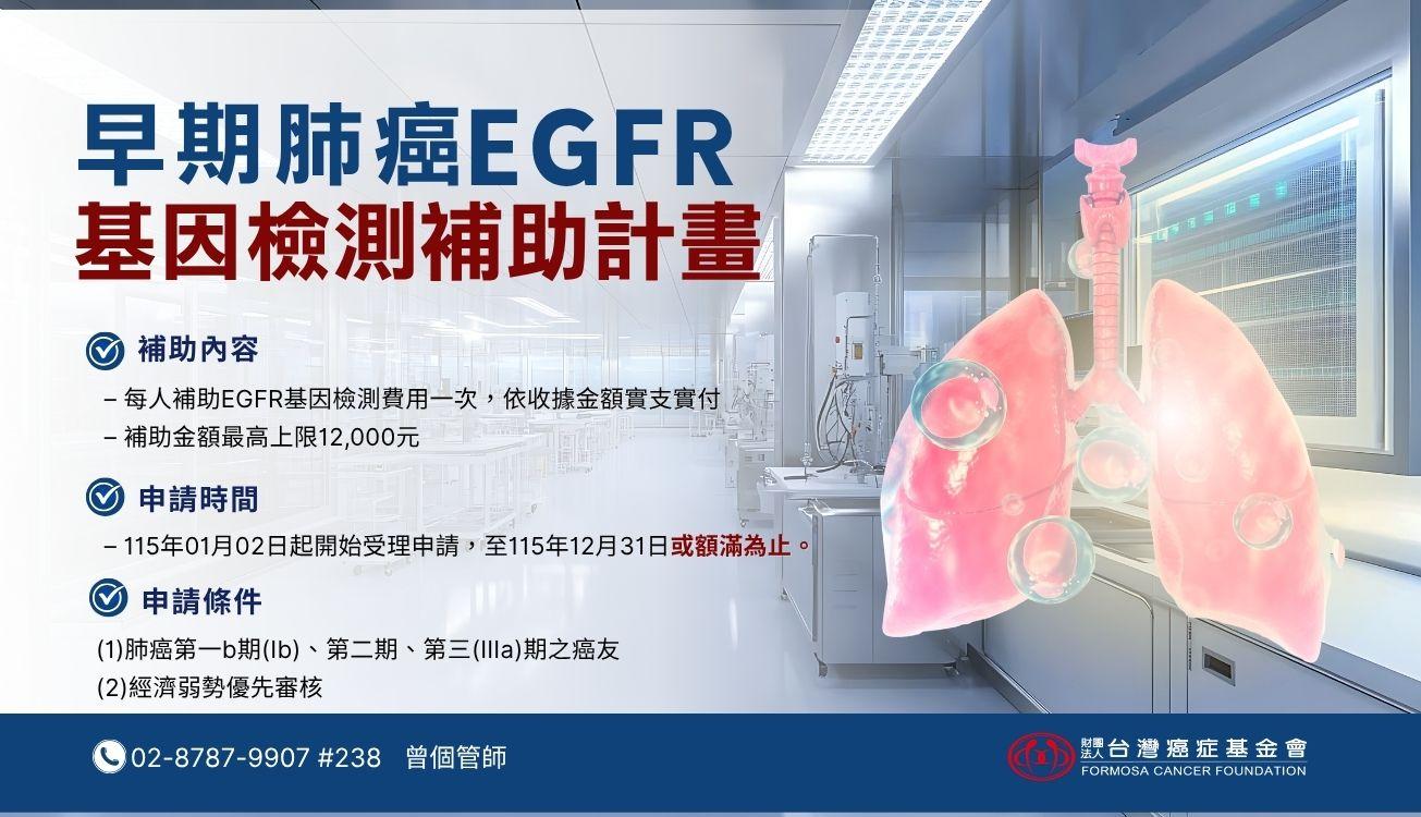 而EGFR早期肺癌的術後輔助治療,除化學治療外,搭配相對應基因的精準治療,能有效降低約八成復發風險,幫助早期肺癌治療邁入新突破。有鑑於掌握肺癌基因突變,對早期肺癌治療之重要性,台灣癌症基金會提供107名早期肺癌患者EGFR基因檢測補助,以幫助醫師與早期肺癌病友有更多利器,幫助早期治療策略擬定之評估。