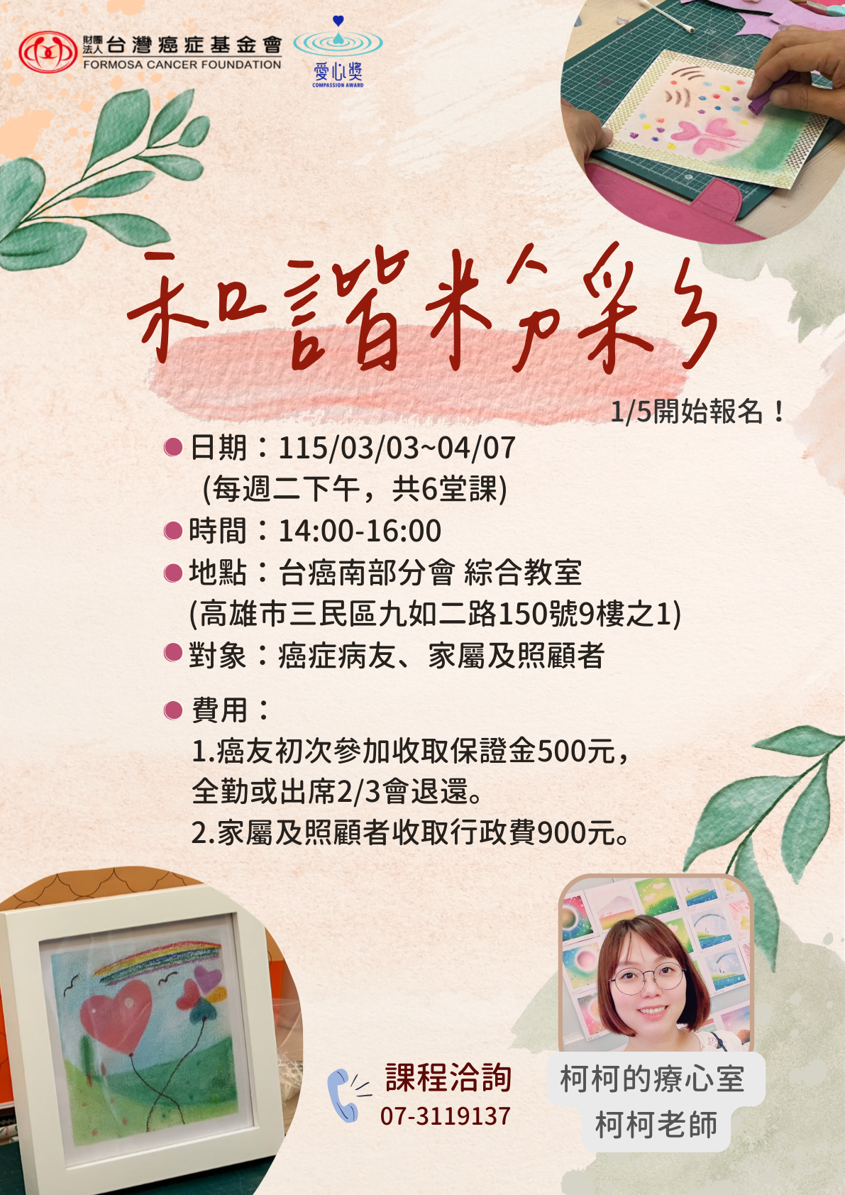 【高雄身心靈】和諧粉彩班 收藏文章 友善列印 收藏文章 報名訊息 活動地點: 高雄市三民區九如二路150號9樓之1(本會綜合教室) 可報人數: 2人 活動日期: 2026-03-03 報名日期: 2026-02-28 截止 諮詢課程內容