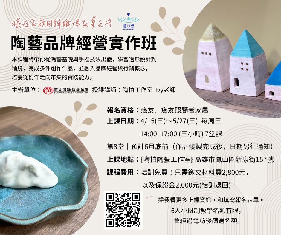 【南部課程訊息】癌症家庭回歸職場職能培訓班-陶藝品牌經營實作班