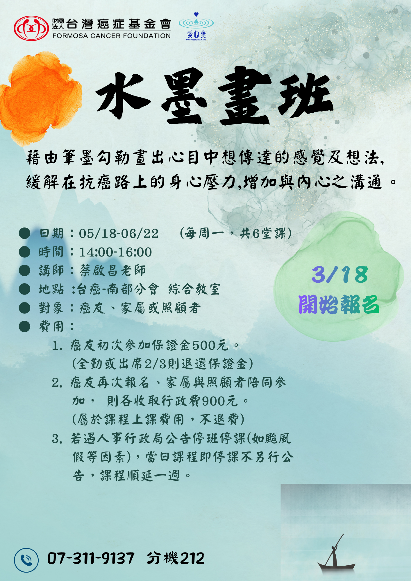 【高雄身心靈】水墨畫班(03/18開始報名) 收藏文章 友善列印 收藏文章 報名訊息 活動地點: 高雄市三民區九如二路150號9樓之1(本會綜合教室) 可報人數: 11人 活動日期: 2026-05-18 報名日期: 2026-05-15 截止 諮詢課程內容