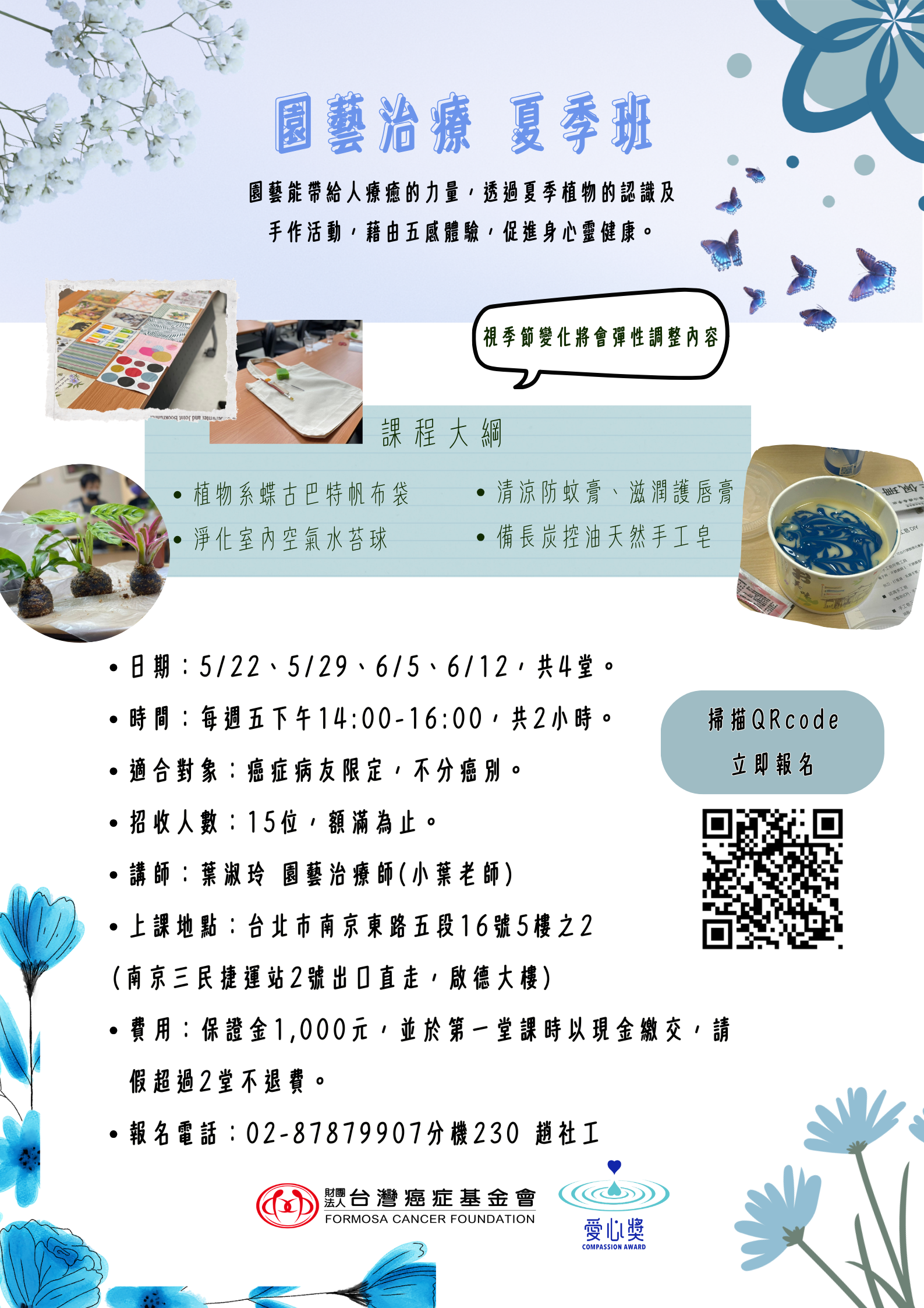 【2026 台北身心靈】園藝治療夏季班 收藏文章 友善列印 收藏文章 報名訊息 活動地點: 台北市松山區南京東路五段16號5樓之2 可報人數: 15人 活動日期: 2026-05-22 報名日期: 2026-05-21 截止 諮詢課程內容