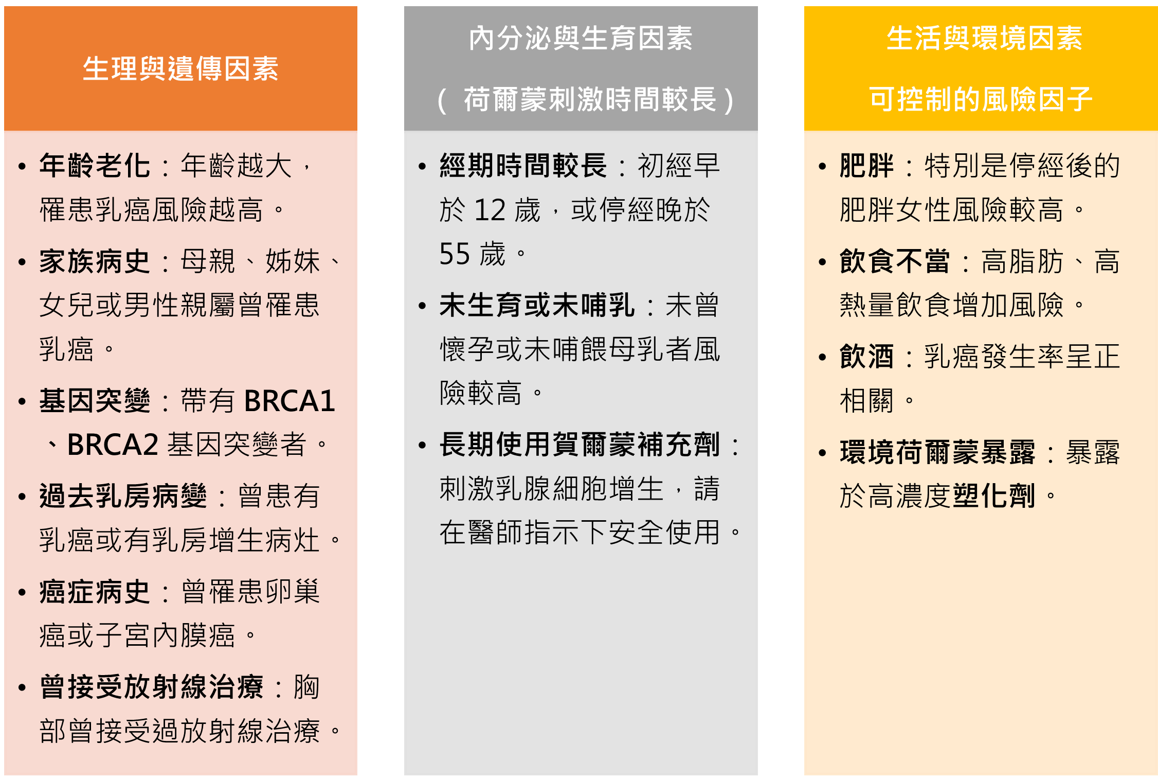 女性乳房是由分泌乳汁的乳房小葉、腺體、乳管(將乳汁從乳房小葉送往乳頭的小管)、脂肪、結締組織、血管及淋巴管組成。當乳管或乳小葉細胞不受生長調控而異常分裂繁殖,就會造成惡性腫瘤。多數乳癌發生在乳管,乳小葉次之。由於乳房周圍有豐富血管、淋巴管與淋巴結,容易擴散到其他器官,所以早期診斷跟妥善治療,是非常重要的。