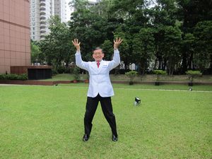 - 做法:左腳提起,用右腳站,雙手揚起一高一低如打太極拳架式,換右腳抬起,用左腳站,比同架式(運動),再站回半蹲,拍拍大腿;比大拇指向右,比大拇指向左,再雙手腕反轉,掌心向上,向前向外送出。