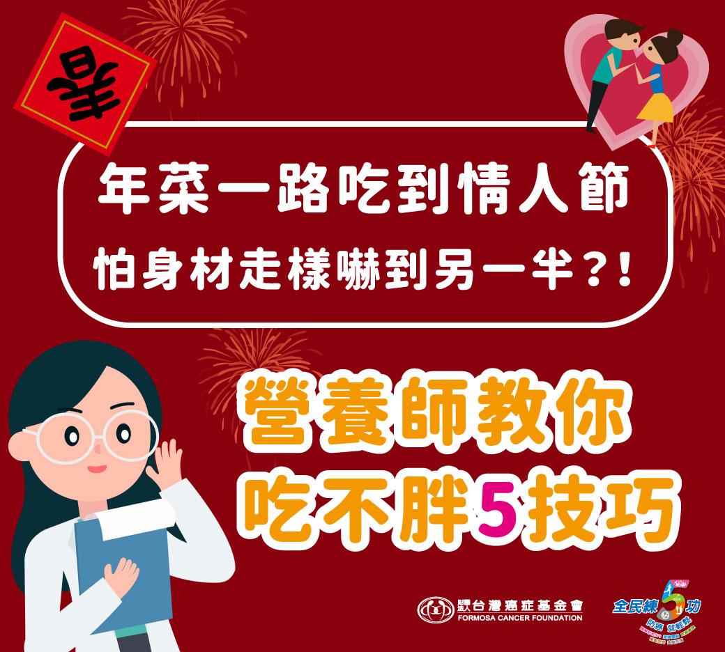 今年過年來的晚,年假最後一天適逢情人節,與家人聚餐、戀人約會免不了大吃大喝,但也因此攝取過多的熱量,看著各式美味,甚麼都不敢吃,也太折磨人!台灣癌症基金會營養師徐桂婷分享5招吃不胖技巧,安心吃,避免過年團圓,肚肚也團圓!