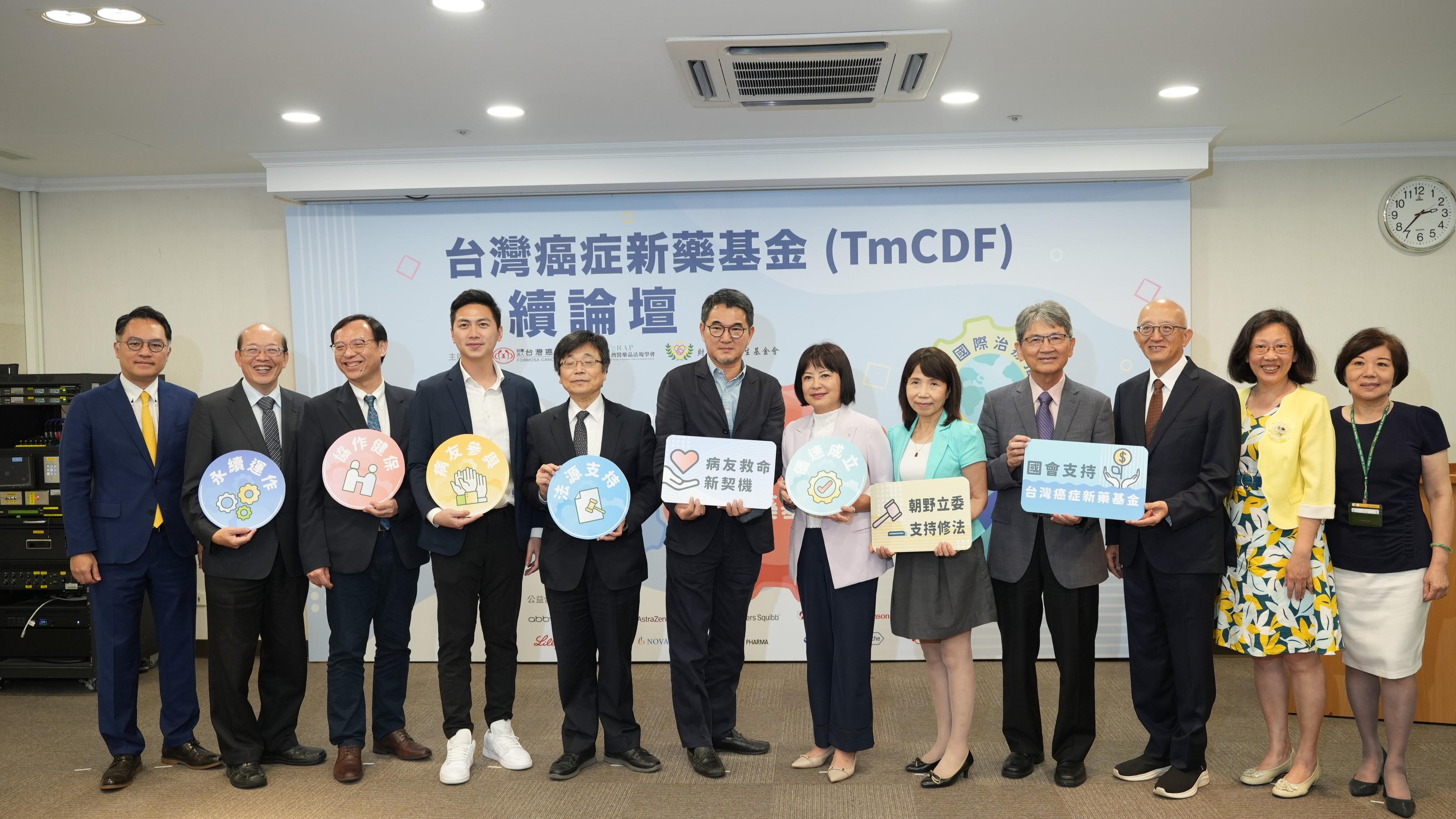 台灣癌症基金會、台灣醫藥品法規學會、厚生基金會於7月2日舉辦「台灣癌症新藥基金(TmCDF)永續記者會」(左起為厚生基金會陳柏同執行長、台灣癌症基金會張文震執行長、健保署石崇良署長、立委廖偉翔、衛福部周志浩次長、立委劉建國、立委林月琴、立委陳昭姿、立委王正旭、台灣醫藥品法規學會康照洲理事長、台大醫學院沈麗娟副院長、台灣癌症基金會蔡麗娟副執行長)
