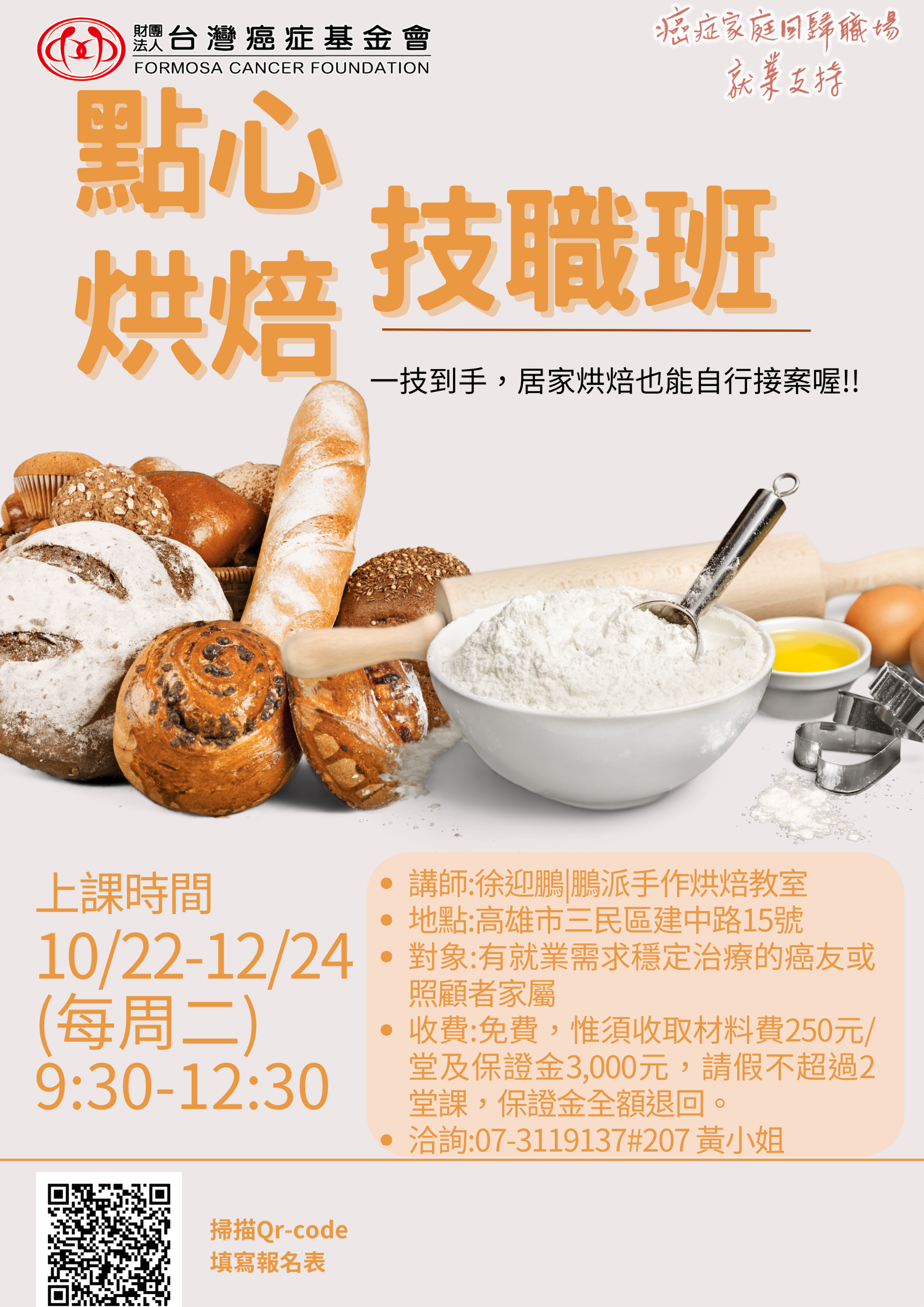 【南部課程訊息】癌症家庭回歸職場就業支持職能學堂 - 點心烘焙技職班 收藏文章 友善列印 收藏文章 報名訊息 活動地點: 高雄市三民區建中路15號 可報人數: 報名結束 活動日期: 2024-10-22 報名日期: 2024-10-22 截止 諮詢課程內容