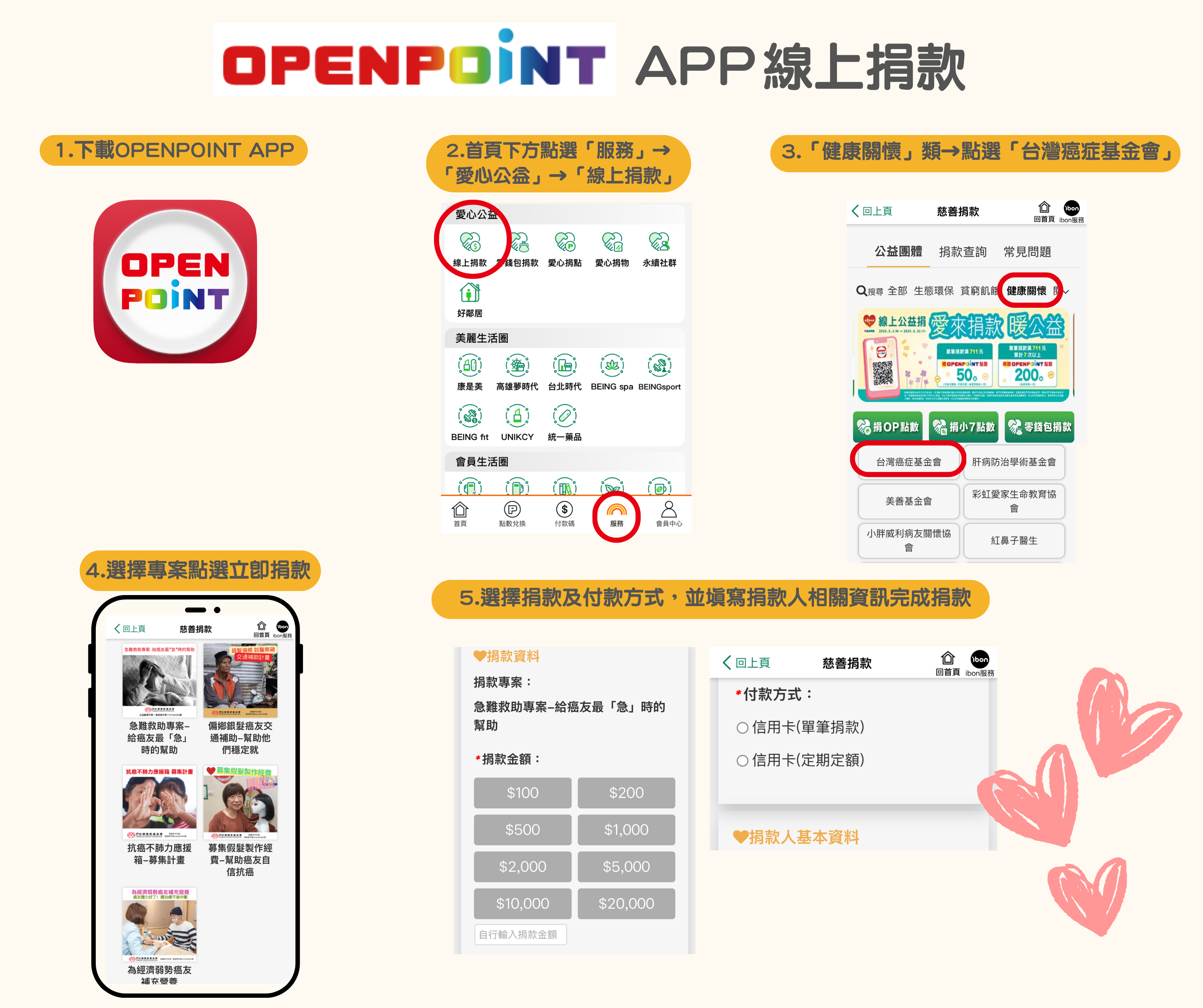 🔸OPENPOINT APP捐款:下載APP成為OPENPOINT APP會員,於APP首頁下方點選「服務」→「愛心公益」→「線上捐款」→「健康關懷」類→點選「台灣癌症基金會」進行捐款