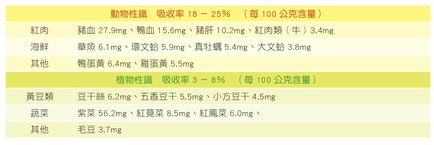 鐵質又分為動物性鐵和植物性鐵,一般來說選擇含量高又好吸收食材建議以動物性鐵質為主,雖然植物性鐵質也可以補血,但相對來說相對吸收率較低。