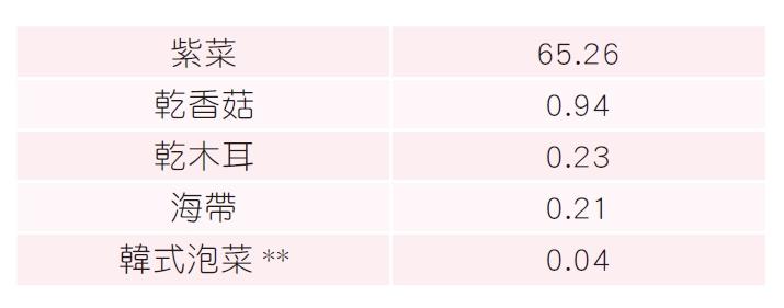 ** 韓式泡菜為醃漬物品不過量攝取,建議全素者先從前四名海菜類攝取為佳。