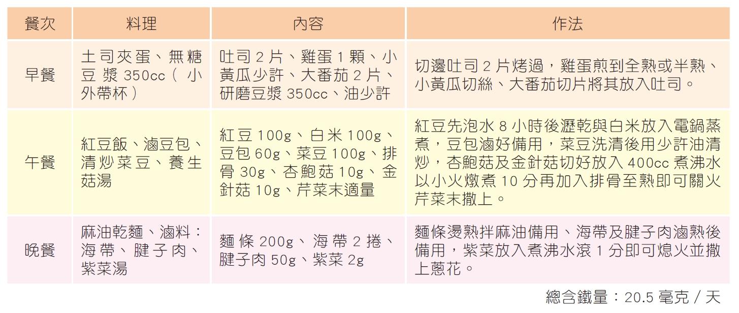 根據衛福部國健署《國人膳食營養素參考攝取量》建議,各年齡層的每日建議鐵質攝取量參考以下圖表