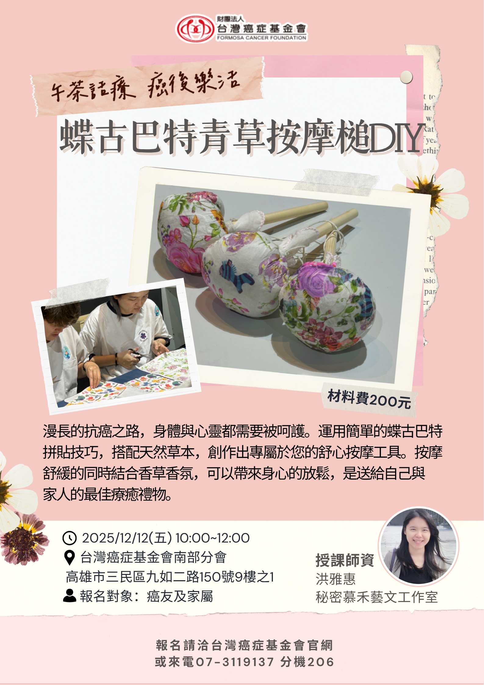 【高雄午茶話療講座】蝶古巴特按摩青草槌DIY(11/05開始報名) 收藏文章 友善列印 收藏文章 報名訊息 活動地點: 高雄市三民區九如二路150號9樓之1(本會綜合教室) 可報人數: 15人 活動日期: 2025-12-12 報名日期: 2025-12-11 截止 諮詢課程內容