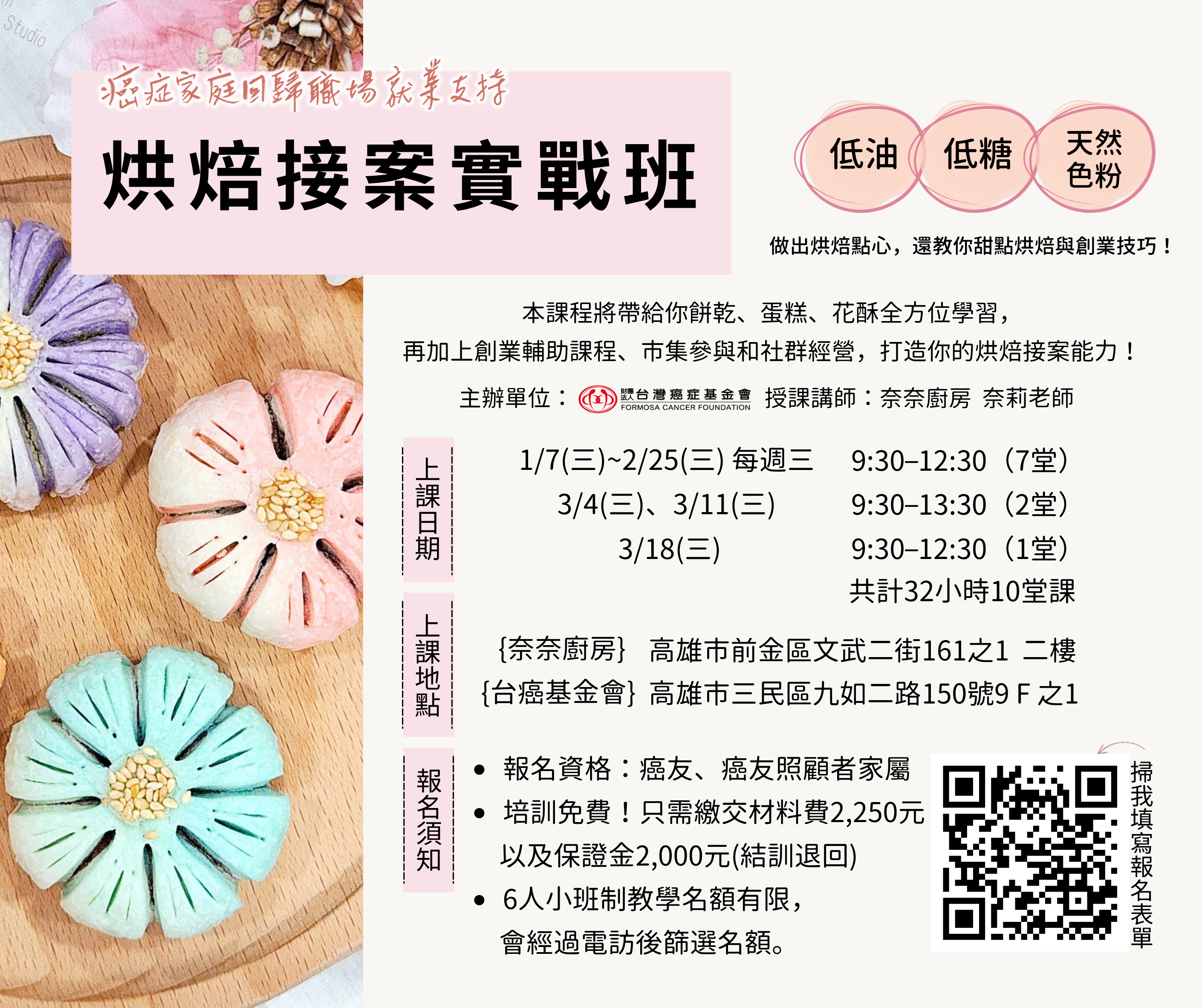 【南部課程訊息】癌症家庭回歸職場職能培訓班-烘焙接案實戰班