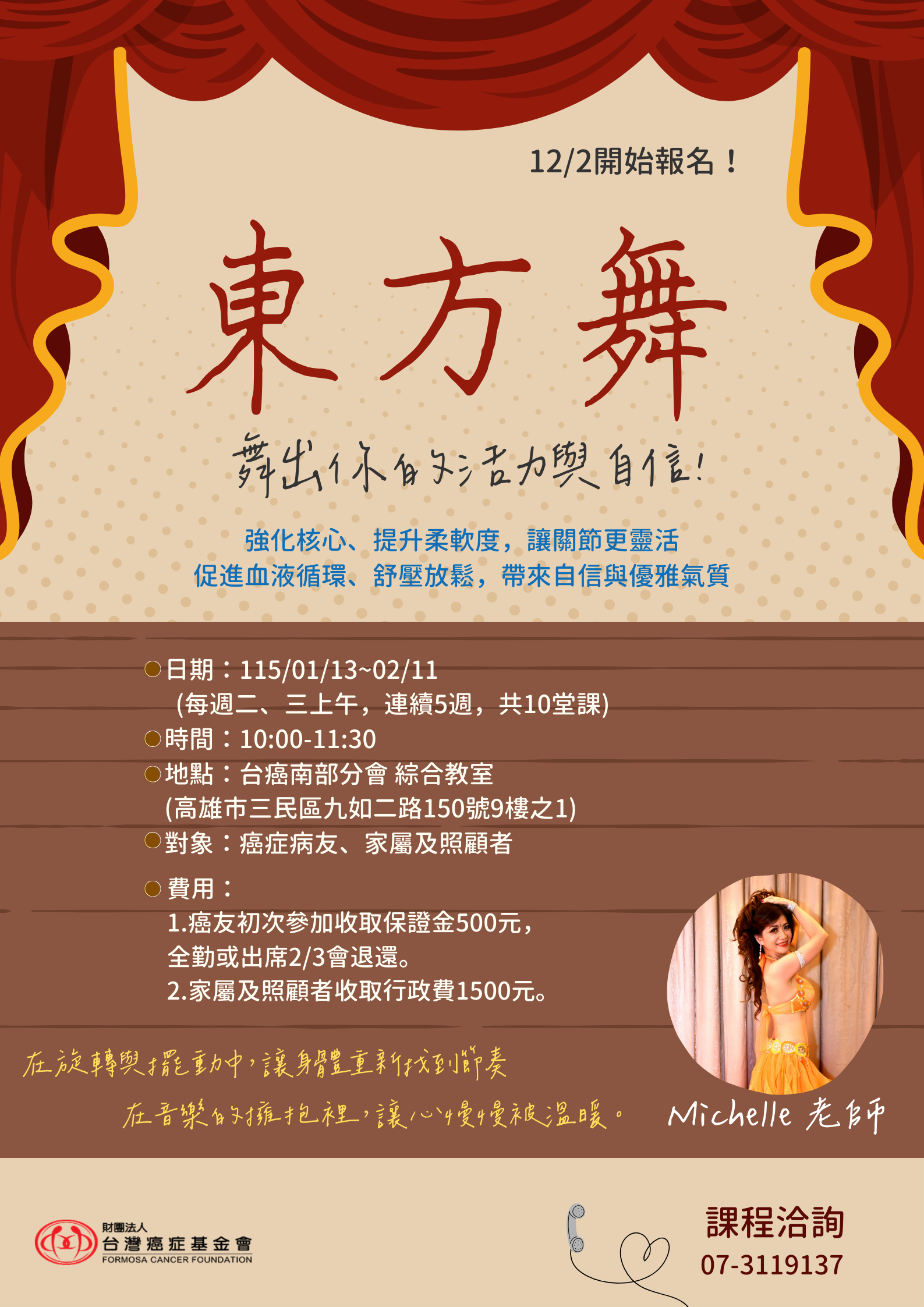 【高雄身心靈】東方舞班 收藏文章 友善列印 收藏文章 報名訊息 活動地點: 高雄市三民區九如二路150號9樓之1(本會綜合教室) 可報人數: 已額滿可候補 活動日期: 2026-01-13 報名日期: 2026-01-06 截止 諮詢課程內容