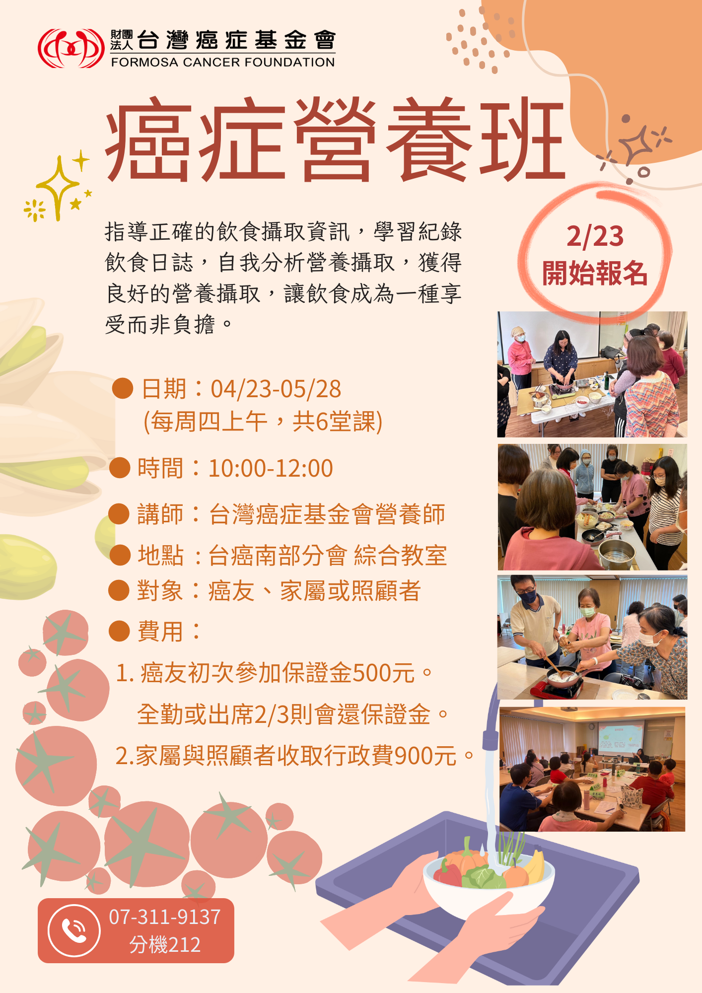 【高雄身心靈】癌症營養班(02/23開始報名) 收藏文章 友善列印 收藏文章 報名訊息 活動地點: 高雄市三民區九如二路150號9樓之1(本會綜合教室) 可報人數: 5人 活動日期: 2026-04-23 報名日期: 2026-04-22 截止 諮詢課程內容