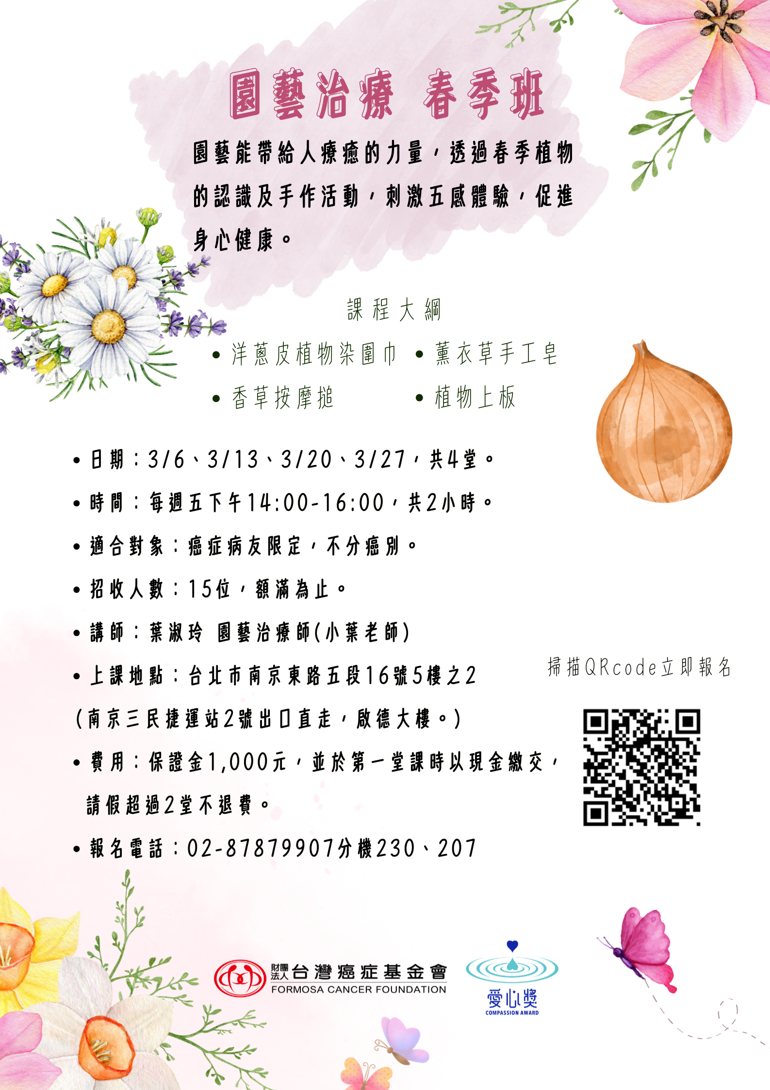 【2026 台北身心靈】園藝治療 收藏文章 友善列印 收藏文章 報名訊息 活動地點: 台北市松山區南京東路五段16號5樓之2 可報人數: 已額滿可候補 活動日期: 2026-03-06 報名日期: 2026-03-02 截止 諮詢課程內容