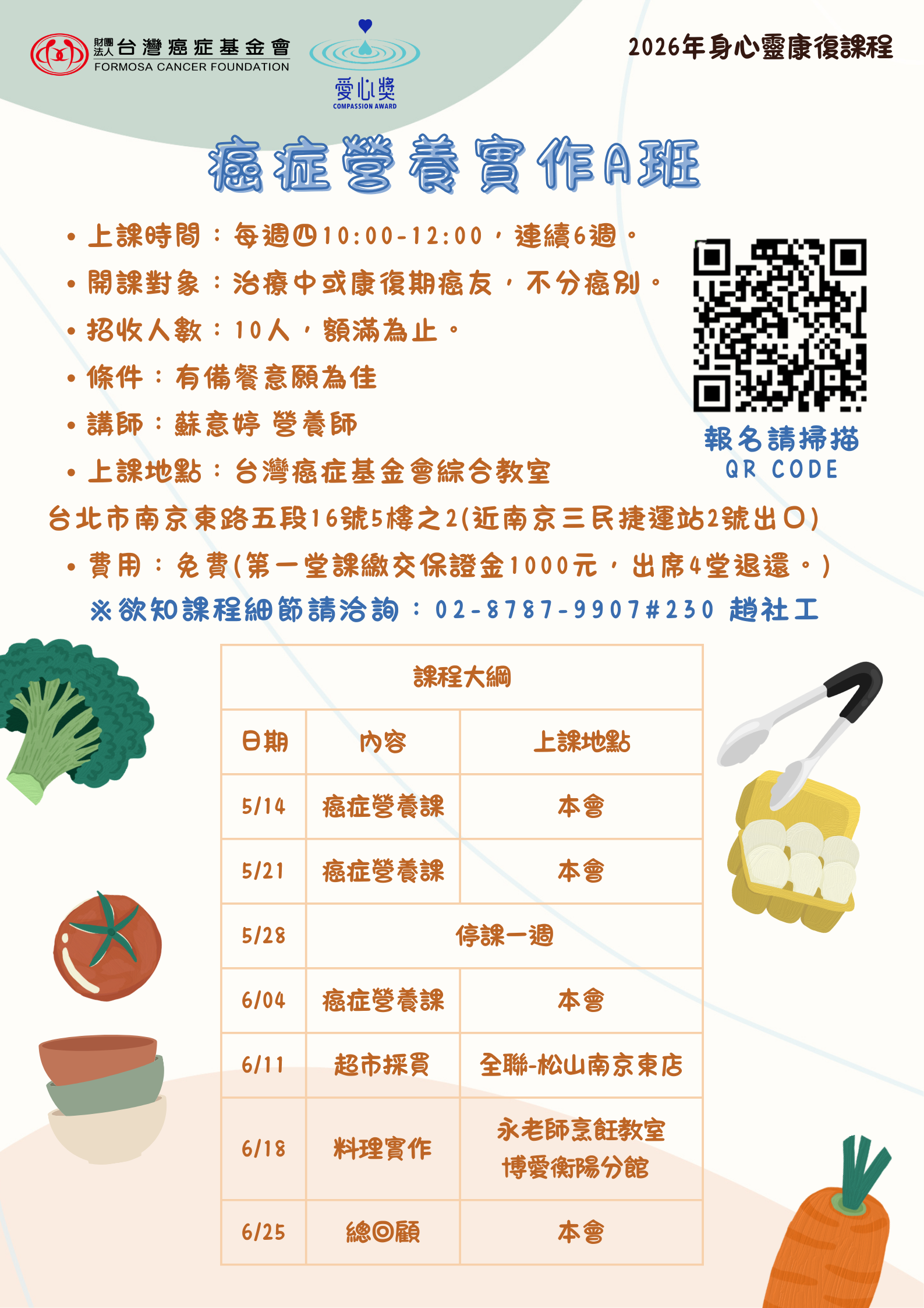 【2026 台北身心靈】癌症營養實作A班 收藏文章 友善列印 收藏文章 報名訊息 活動地點: 台北市松山區南京東路五段16號5樓之2 可報人數: 14人 活動日期: 2026-05-14 報名日期: 2026-05-13 截止 諮詢課程內容