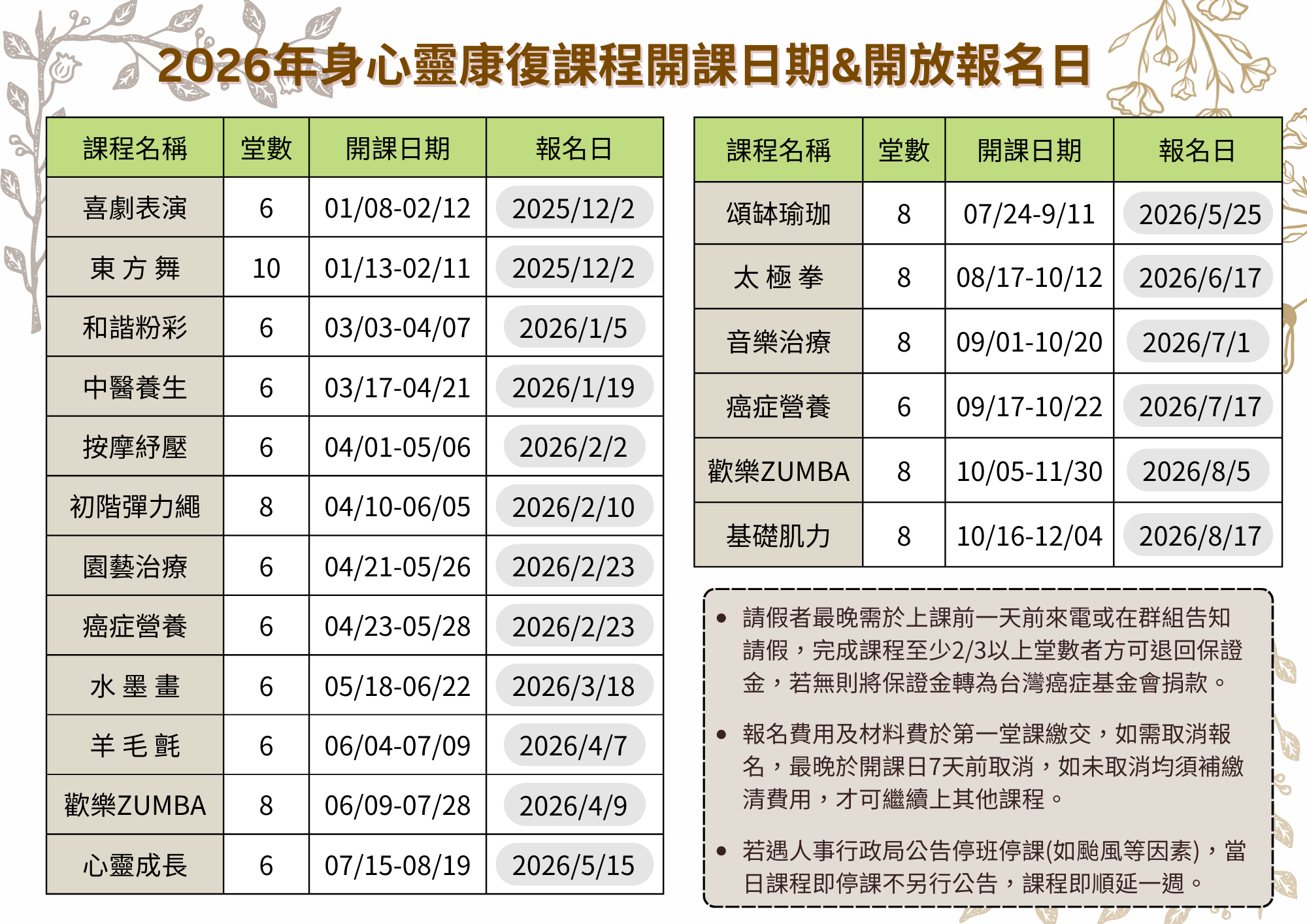 2.為讓更多新癌友使用身心靈課程服務,新生報名優先錄取,舊生報名上課依報名順序錄取,若有人取消報名則依序遞補,基金會保有最終解釋與修改之權利,皆會於開課前一周電話通知。